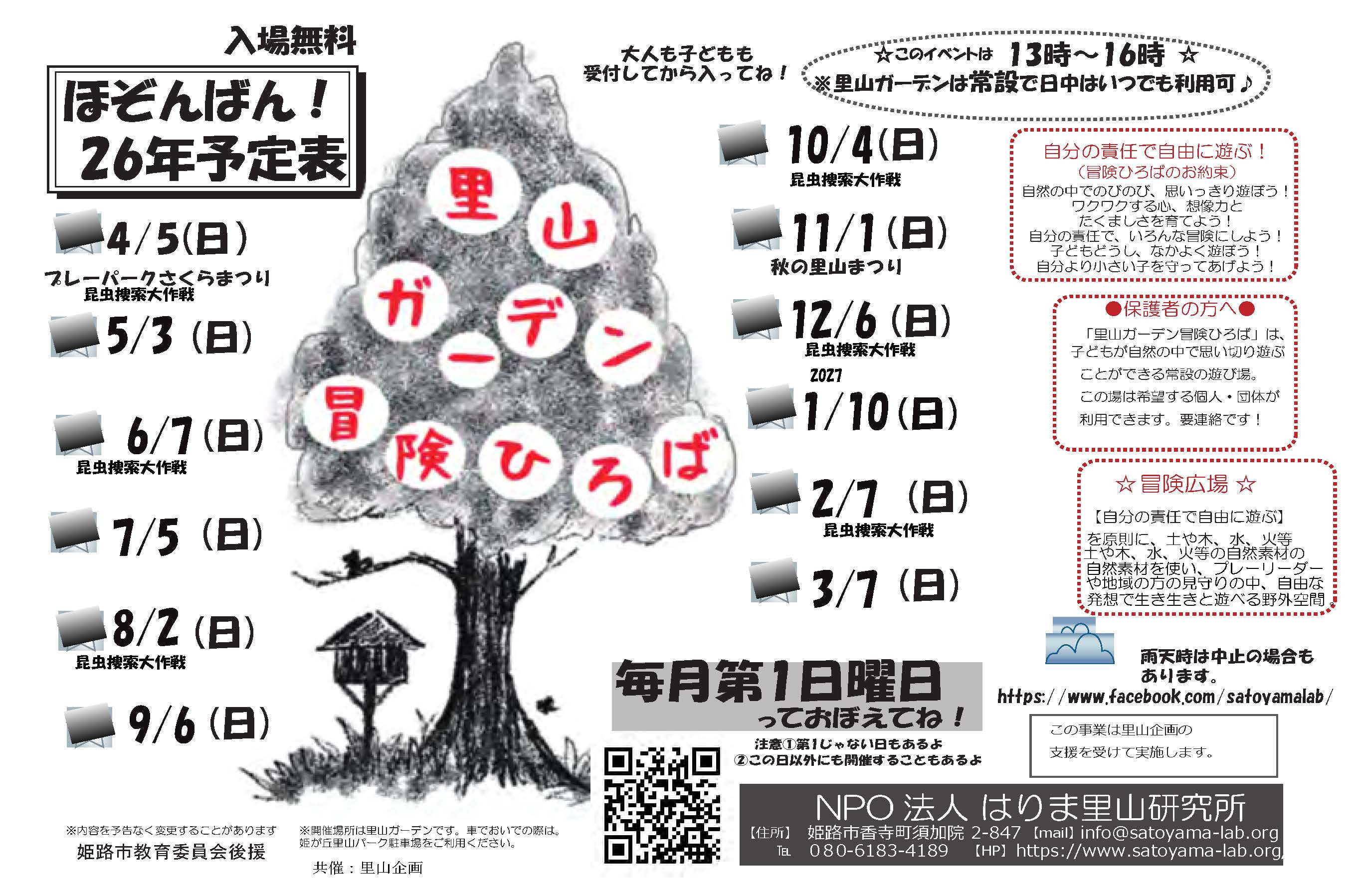 このHPは里山ガーデンを通じた諸活動を紹介する目的で作成されています。 その目的の一つとしてNPO法人はりま里山研究所の活動やNPOの報告等も掲載しています。 NPO法人はりま里山研究所は里山の整備と教育研究を通し「山・川・海」のつながりに関わる理解を深め環境を学び体験する活動や花と緑の活動を通して地域の活性化を目指します。 その他、里山企画として各種団体に里山ガーデンを使っていただいています。 お知らせ 新着2026年 2026年オープンガーデン前期は4月10日(金)から4月12日(日) 後期は5月15日(金)から5月17日(日)いずれも10時から16時まで ニュース 2025年 11月24日にビブリオバトル&プレーパーク開催 11月7日 林幸一郎氏がNPO事務局長に就任 11月2日、3日にオープンガーデンを開催します。時間は10時から16時までです。 姫路市ボランティアサポートセンターのnoteで活動紹介されました。2025.8 2025年1月24日に兵庫県のHPサイトですごいすととして2016年に続き紹介されました。 すごいすと2025年 すごいすと2016年 ★オープンガーデン 4月11-13日、5月16-18日 里山ガーデンの庭紹介にショクナナというガーデニング紹介動画で出ています。2023年春の紹介動画 2025年冬の紹介動画 里山ガーデンでは施設利用者を募集しています。 ★2026年度プレーパーク日程表 補助や後援等は未定です。ボランティアプレーリーダーが不在となり募集しています。継続して活動するためのご協力をお願いします。 2023年 ★兵庫県の第25回人間サイズのまちづくり知事賞を受賞しました。兵庫県HP ★NPO理事長の熊谷が令和5年度都市緑化功労者国土交通大臣表彰を受けることになりました。表彰式は2023年10月27日。以下 国土交通省HP 神戸新聞記事 ★2023年11月5日(日)10時-16時 里山まつりとオープンガーデンを開催します。 ★制作から12年が経過し安全の観点から6月24日にツリーハウスを解体しました。またナラガレのコナラについても伐採を進めています。枯れた枝が落ちてくるので枯れた木のそばには寄らないようにお願いします。 ★定例の里山整備は第2土曜日の午前中です。子どもの遊び場の安全確保のため行っています。 ★HPの中に分散して探しづらかったNPO報告書類を一覧にして分かりやすくしました。 ★里山サクラまつりのチラシができました。プレーパークも併設して行います。 ★久光製薬株式会社ほっとハート倶楽部様より寄付金を頂きました(目録贈呈2023.2.8) ★12月10日(日) 福永悠加 ソロコンサート アクリエひめじ ★9月23日(祝) 手柄ザクラ 歌:福永悠加 演奏:姫路ウインドアンサンブル ★手柄ザクラプロジェクト カリンバによる手柄ザクラ(作詞作曲 福永悠加、制作・カリンバ演奏 おてがるカリンバ協会) Youtube及びMP3による演奏です。 手柄ザクラYouTube ★ 姫路ケーブルテレビWinkで「はりまのチカラ」の番組にて手柄ザクラ関係7月中の毎日放送されました。 ★ 2022年5月18日神戸新聞に手柄ザクラ関連の絵本作成と歌制作の記事が掲載されました。 ★2022年5月21日(土)から22日(日)にアクリエひめじで全国花のまちづくり姫路大会が開催されました。同時開催でアクリエひめじでのプレーパークも行いました。。 ★全国花のまちづくり姫路大会リーフレット アクリエひめじで里山プレーパークを開催しました。 里山ガーデンのリーフレット完成、下のボタンからダウンロード可能 リーフレット ★理事長がリビング姫路、リビング加古川2021年10月22日号に紹介されました ★理事長の活動が神戸新聞「播磨びと」で紹介されました。2021年6月27日 ★NPO法人はりま里山研究所理事長が地域環境保全功労者環境大臣表彰を受けました。 2021年6月23日付 また朝日新聞播磨版(2021.7.8)でも紹介されました。 環境省HP兵庫県HP ★姫路独特の桜として2021年5月13日「手柄ザクラ」が新品種に認定されました。詳細は公益財団法人日本花の会 手柄ザクラへのコメントが神戸新聞に掲載されました(2021.5.2) ★オープンガーデン開催 5月19日から5月23日まで及び5月26日から30日まで(終了)。 ★次回プレーリーダー2名配置のイベントプレーパークは11月6日(日) 10:00-16:00 オープンガーデンやコンサート等のイベントも同時開催します。 ★和辻哲郎の紹介をしています ★サイエンスカフェ及び薬膳子ども食堂を開催しています。 お店では少人数・換気・要所の消毒・消毒剤準備で行います。 開催場所は里山カフェ(たつの市神岡町東觜崎)。 ★2021年1月31日 onlineビブリオバトル甲子園開催 チラシ ★2020年2月24日 はりまビブリオバトル 姫路文学館で開催 当日配付資料 ★2020年2月9日 森里海のつながりを考える 姫路市立図書館網干分館で開催 2023年度のプレーパークイベント予定表pdfができました。イベント以外の日も適宜開催しています。プレーパーク実施にあたっては換気の良い屋外で密集・密接を避けて健康維持のための自由な運動(遊び)の場を提供しています。 2022年5月21日(土)はアクリエ姫路1Fスタジオ1にて実施しました。 その他のイベントはスケジュール等をご覧ください! 