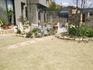 庭に春が来ました。裏山の桜も見事に咲いています。庭の芝生も徐々に青みがかってきています。
